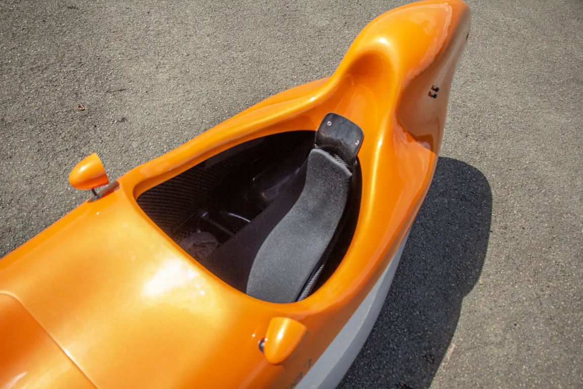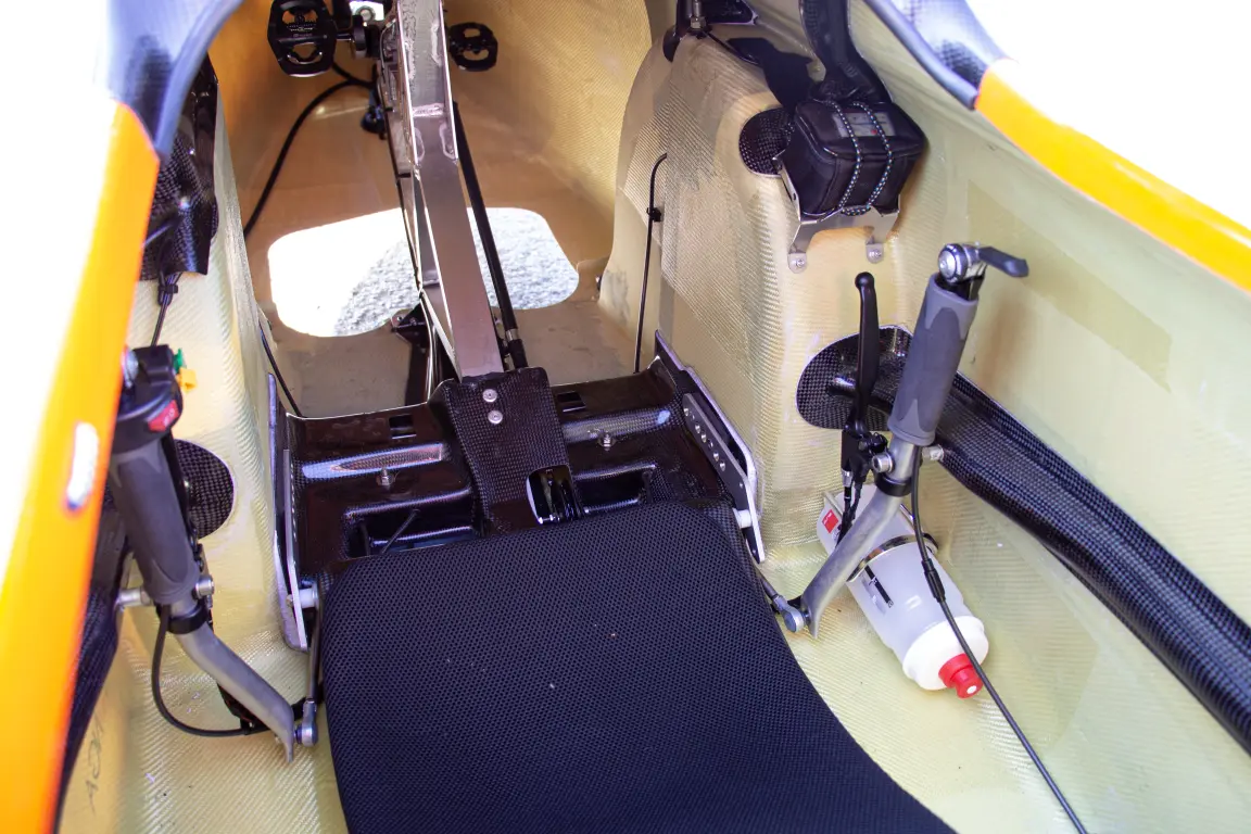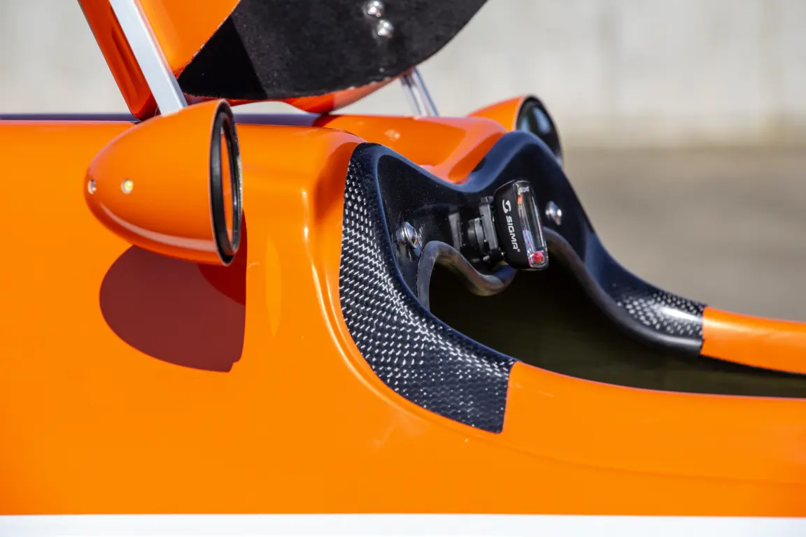 Coque tout carbone, double couleur Blanc/Jaune, rétroviseurs avec coque aérodynamique, capot combi avec jupe néoprène et grandes bosses, mousse de siège Ventisit, direction centrale tiller, Freins à tambours 90mm, Faisceau électrique complet avec hotspot et phare avant Lupine SLX, roues allégées (fratelli, DTswiss), Compteur de vitesse, porte gourde.