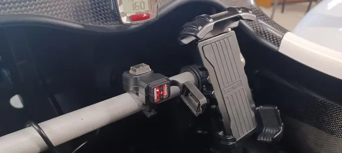 Alimentez vos divers appareils USB à partir du 12V, double port USB (1A et 2.1A) avec interrupteur et collier de fixation sur tube. Avec capuchon de protection étanche