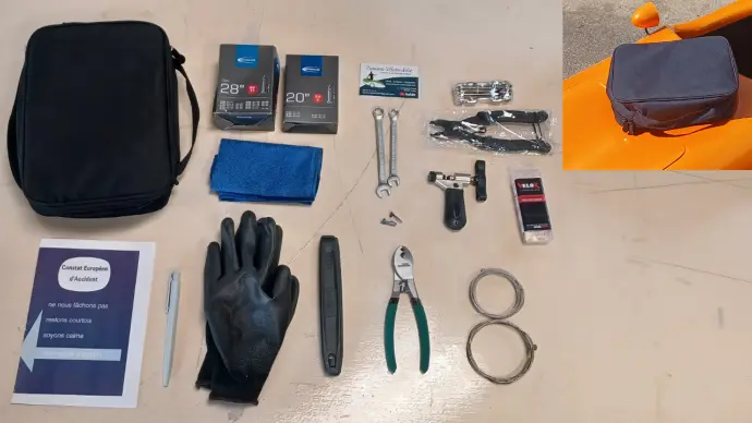 La trousse de secours technique à avoir avec soi pour s'en sortir quoi qu'il arrive ! 2 chambres à air, clés plates, clés Allen, pince à chaine, dérive chaine, kit rustine, câble dérailleur et frein, pince coupe câble, démonte pneu, maillon rapide, gants, chiffon, constat amiable, le tout dans une trousse compartimentée : 99.00€