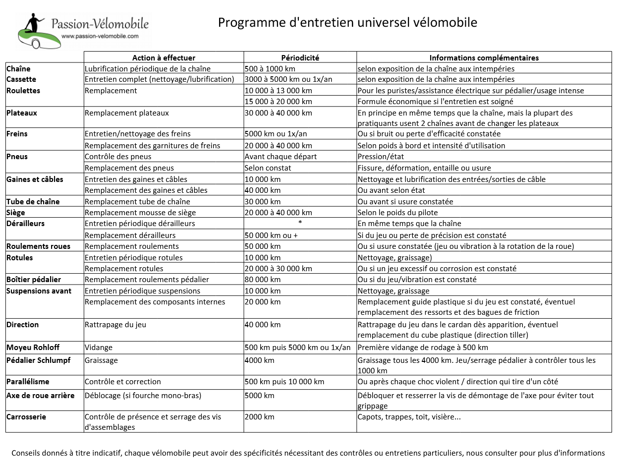 Il nous est fréquemment demandé à quelle échéance il est nécessaire d'entretenir ou de remplacer un composant. Entre la fiabilité mécanique, le confort acoustique et accessoirement : la sécurité ! Il est bien évidemment utile d'entretenir votre vélomobile pour en profiter le plus longtemps possible !